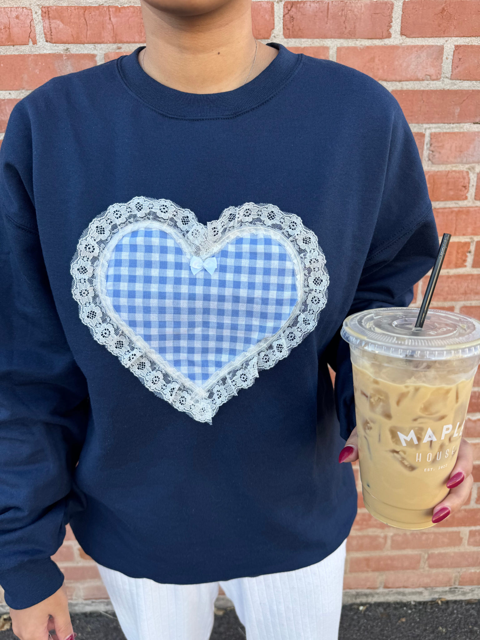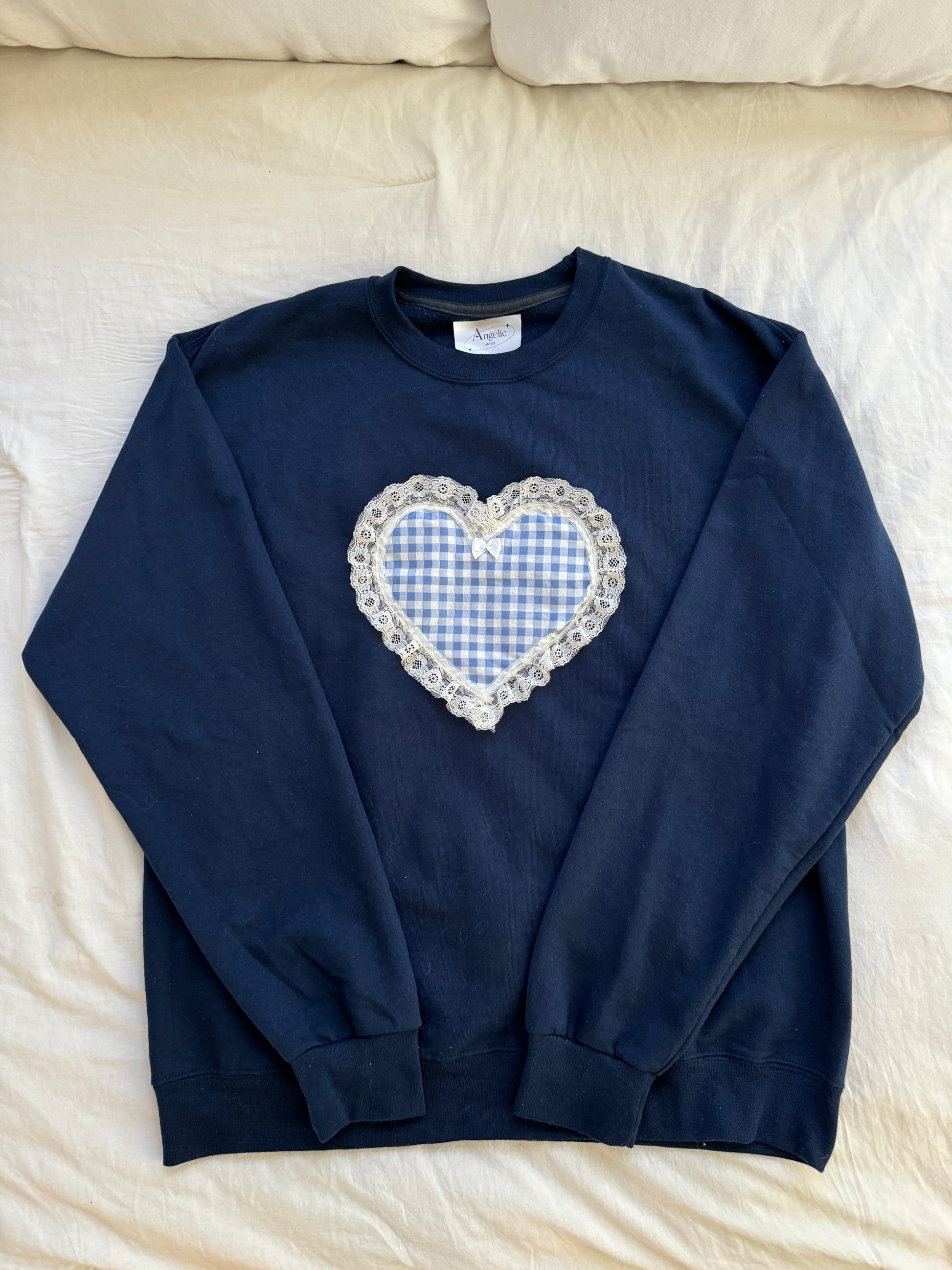 - Navy crewneck sweatshirt with a blue plaid lace heart